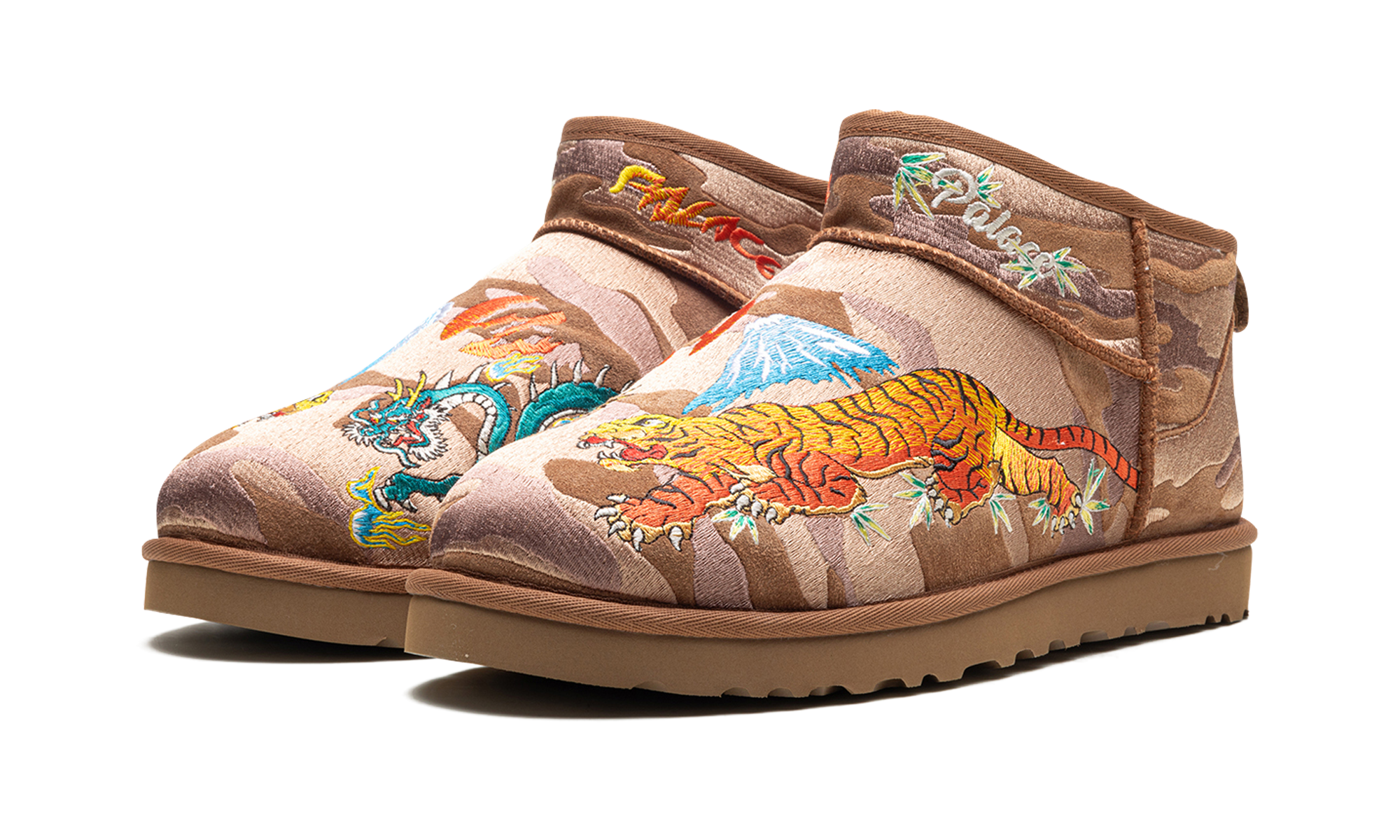 Step into exclusive streetwear comfort with the Mini Boot Palace "Chestnut Camo". This celebrated collaboration features a classic UGG boot updated with a Palace camo pattern on the chestnut suede. The plush wool lining and durable outsole deliver ultimate warmth and a bold aesthetic, perfect for making a statement indoors or out.
